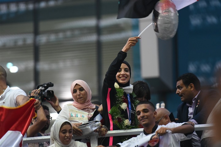 واستقبل الدكتور أشرف صبحي وزير الشباب والرياضي الثنائي وسط استقبال جماهيري حافل حيث تم تخصيص حافلة مكشوفة من أجل الاحتفال بالانجاز الذي حققه الثنائي.