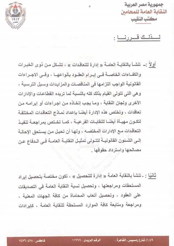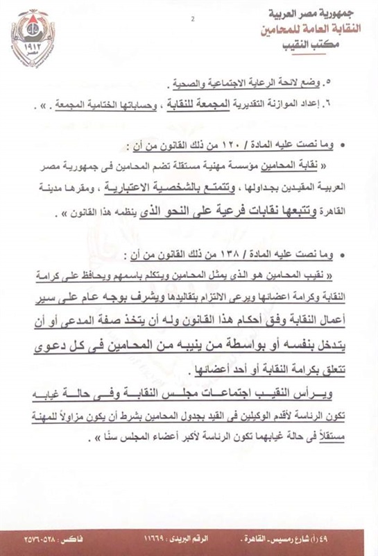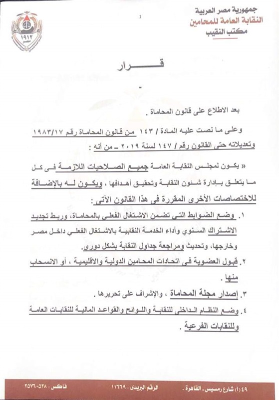 وأوضح أن القرار جاء بعد الاطلاع على قانون المحاماة، وعلى ما نصت عليه المادة 143 من قانون المحاماة رقم 171983 وتعديلاته حتى القانون رقم 147 لسنة 2019 ــ من أنه « يكون لمجلس النقابة العامة جميع الصلاحيات اللازمة فى كل ما يتعلق بإدارة شئون النقابة وتحقيق أهدافها، ويكون له بالإضافة للاختصاصات الأخرى المقررة فى هذا القانون الآتى: