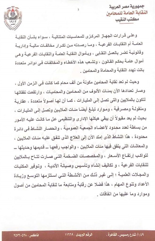 أما عن قرارات الجهاز المركزى للمحاسبات المتتالية، سواء بشأن النقابة العامة أم النقابات الفرعية، وما رصدته من تكرار مخالفات مالية وإدارية وقانونية تضر بالعمل النقابى، وبأموال النقابة العامة والنقابات الفرعية وهى أموال عامة بحكم القانون، وتشعب هذه الأخطاء والمخالفات فى دوائر متعددة باتت تهدد النقابة والمحاماة والمحامين، قال أن نقابة المحامين مكونة من ألف محام كما كانت فى الزمن الأول، وصار تعدادها الآن بمئات الألوف من المحامين والمحاميات، وارتفعت نفقاتها لتكون بالملايين والتى تصل إلى المليارات، كما أن لها أصولًا متعددة، عقارية ومنقولة ومصرفية، وموارد تبلغ أيضًا مئات الملايين وتصل إلى المليارات، بحيث لم يعد مقبولًا أن يبقي هيكلها الإدارى والتنظيمى عل ما كانت عليه الأمور من بساطة لعدد محدود لأعضاء الجمعية العمومية، وانحصار النشاط فى دائرة محدودة، هذا النشاط الذى إمتد الآن إلى العلاج الذى تنفق عليه مئات الملايين، والمعاشات التى ينفق فيها مئات الملايين، والواجب رفعها ــ قديمها وحديثها ــ لتواكب إرتفاع الأسعار، والمخصصات الضخمة التى صارت تتاح بالملايين للنقابات الفرعية، وتكاليف إنشاء وتأسيس وصيانة الأندية، وتوفير المكتبات والمجلات العلمية ؛ إلى غير ذلك من الأنشطة التي استلزمها التوسع وزيادة الأعداد وتنوع المهام، هذا فضلا عن رقابة ومتابعة ما لنقابة المحامين من أصول وموارد وما عليها من انفاقات.
