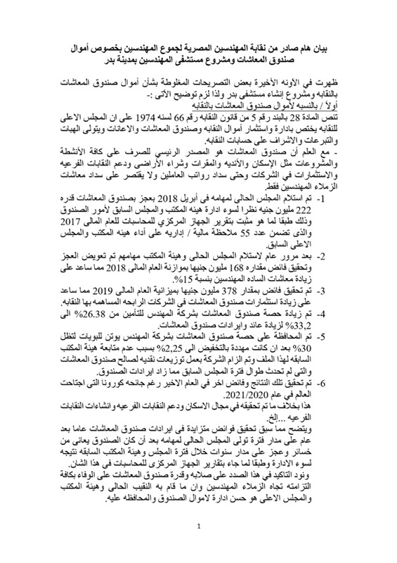 أكدت نقابة المهندسين المصرية بقيادة هاني ضاحي النقيب العام، أنه ظهر في الآونة الأخيرة بعض التصريحات المغلوطة بشأن أموال صندوق المعاشات بالنقابه ومشروع إنشاء مستشفى بدر ولذا لزم توضيح الآتى:-