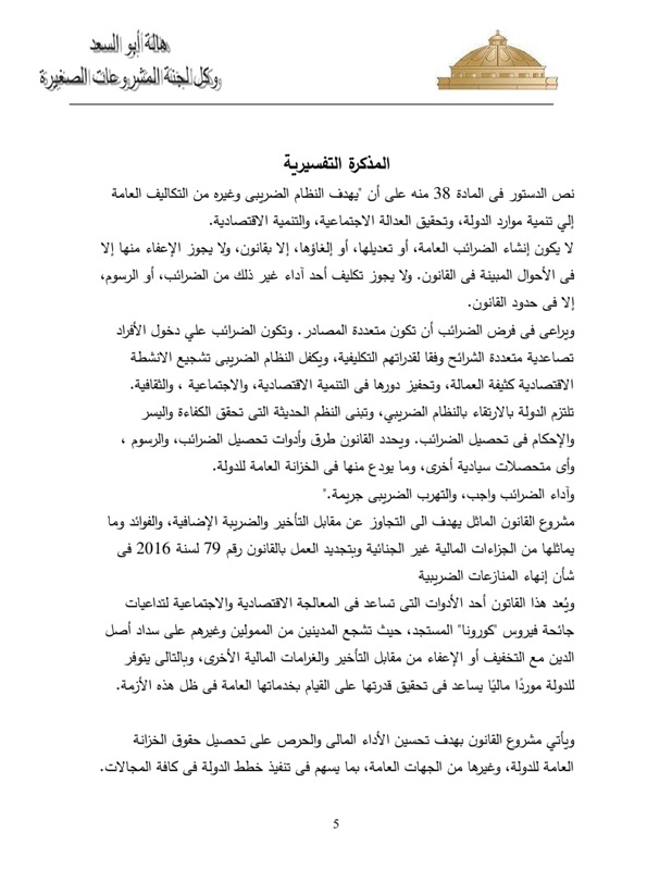 ونصت المادة الأولى من مواد مشروع القانون، علي أن يتجاوز عن مقابل التأخير والضريبة الإضافية المنصوص عليهما في كل من قانون الجمارك الصادر بالقانون رقم 66 لسنة 1963، وقانون ضريبة الدمغة الصادر بالقانون رقم 111 لسنة 1980، وقانون الضرائب على الدخل الصادر بالقانون رقم 157 لسنة 1981، والقانون رقم 147 لسنة 1984 بفرض رسم تنمية الموارد المالية للدولة، وقانون الضريبة العامة على المبيعات الصادر بالقانون رقم 11 لسنة 1991، وقانون الضريبة على الدخل الصادر بالقانون رقم 91 لسنة 2005، وقانون الضريبة على العقارات المبنية الصادر بالقانون رقم 196 لسنة 2008، وقانون الضريبة على القيمة المضافة الصادر بالقانون رقم 67 لسنة 2016، وذلك بالنسبة إلى الضريبة أو الرسم المستحق أو واجب الأداء قبل تاريخ العمل بهذا القانون بشرط أن يقوم الممول أو المكلف بسداد أصل دين الضريبة أو الرسم كاملًا بدءًا من تاريخ العمل بهذا القانون، وذلك طبقًا لما يأتي:
