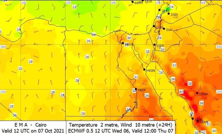 ويشهد اليوم الخميس، استمرار الأجواء الخريفية على كافة الأنحاء، حيث يسود طقس مائل للحرارة على القاهرة الكبرى والوجه البحرى وشمال الصعيد معتدل على السواحل الشمالية، مائل للحرارة على جنوب سيناء، حار جنوب البلاد.