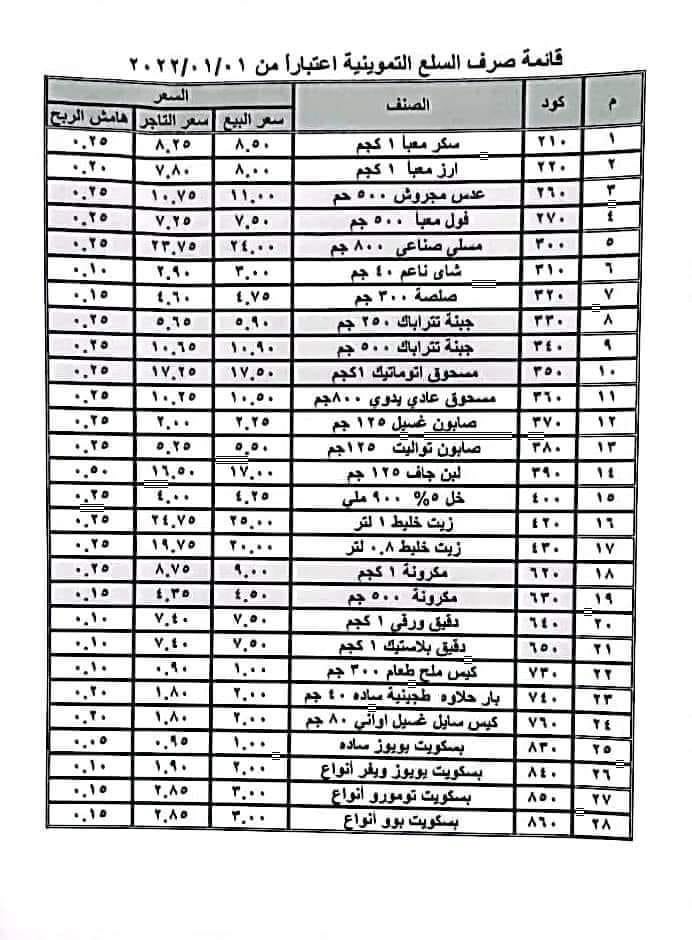 وحصلت "الفجر" على نسخة من قائمة صرف السلع التموينية اعتبارًا من ١ /١ / ٢٠٢٢: