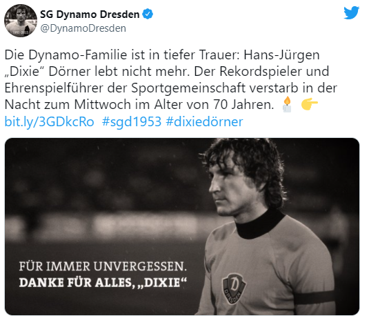 وعبر حسابه الشخصي على موقع التواصل الإجتماعي تويتر نشر نادي دينامو دريسدن تغريدة أفاد خلالها بوفاة هانز يورجن دونر الشهير بـ "ديكسي" عن عمر يناهز 70 عامًا بعد صراع طويل مع المرض.