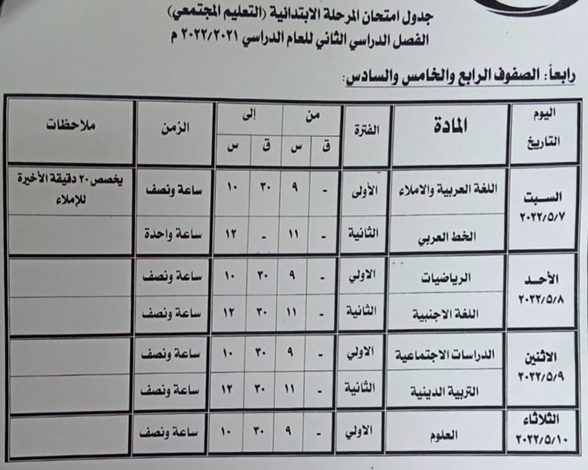 - الصفوف الرابع والخامس والسادس " من 7 إلى 10 مايو 2022"
