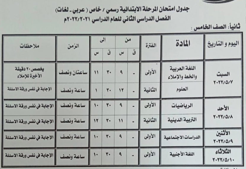 ـ الصف الخامس  الابتدائي "من 7  إلى 10 مايو  2022 "