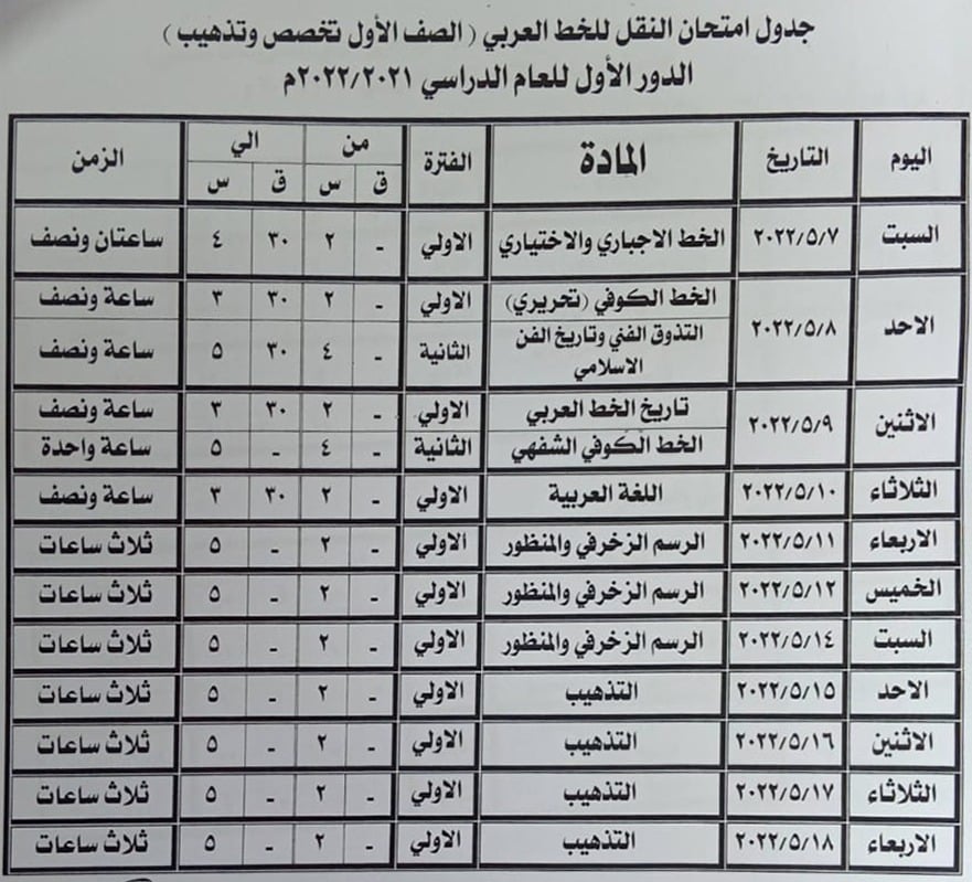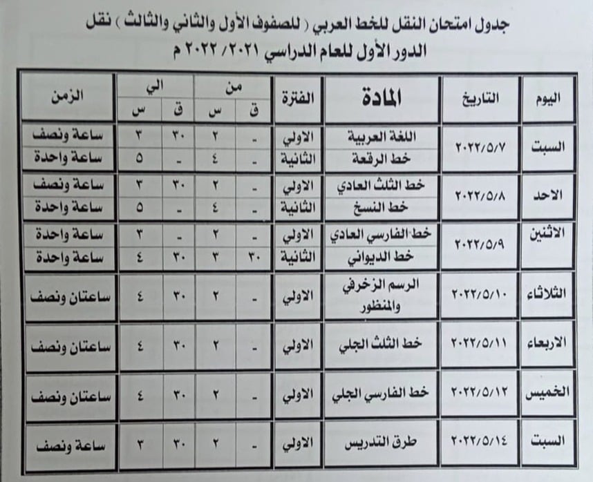 - نقل دبلوم الخط العربي (الصفوف الأربعة) "من 7 إلى 14 مايو 2022".