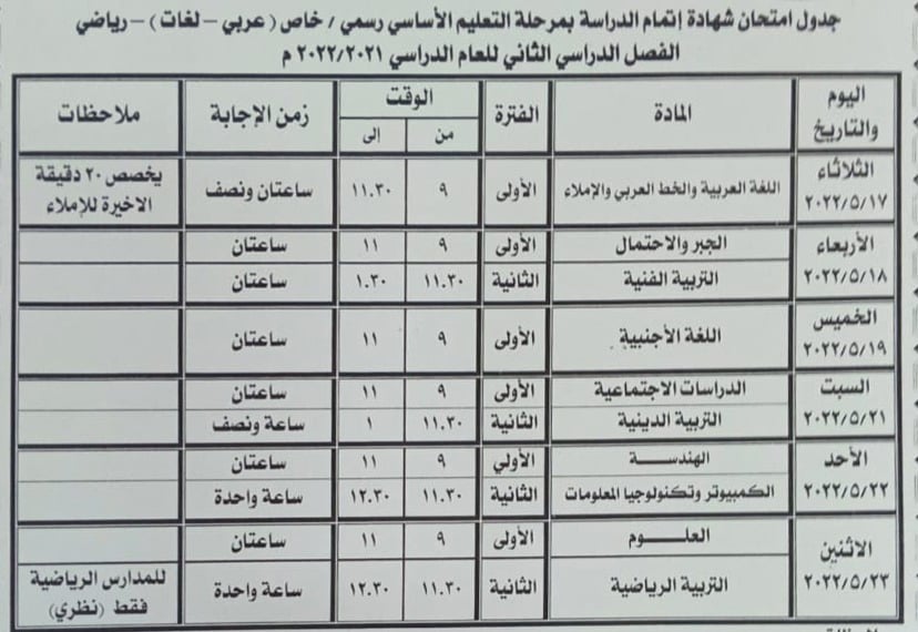 حصلت "الفجر" على جداول امتحانات الفصل الدراسي الثاني للعام الحالي 2021/2022م، لصفوف النقل والشهادات العامة المحلية في محافظة بني سويف.