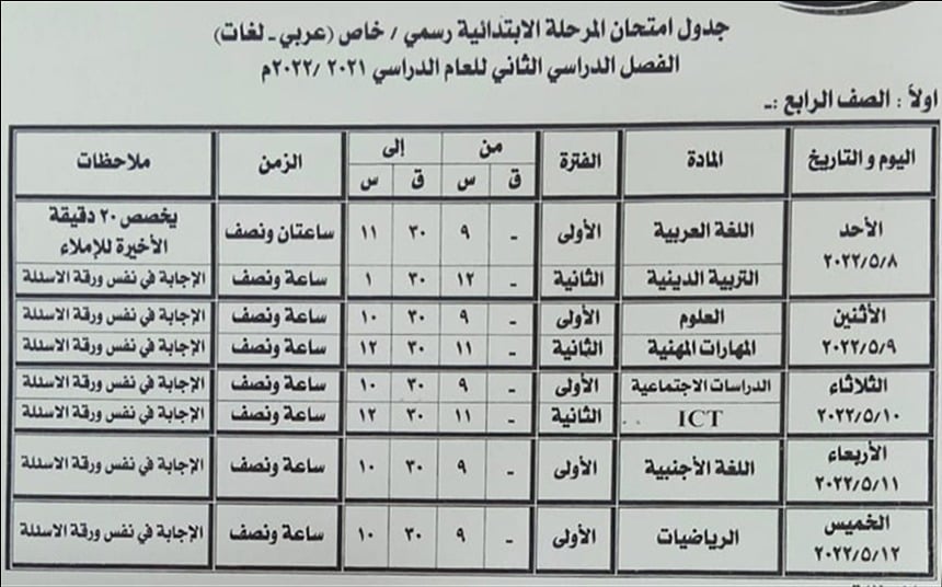 ـ الصف الرابع الابتدائي "من 8  إلى  12 مايو 2022"