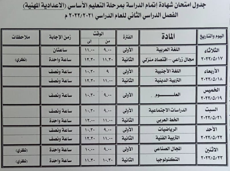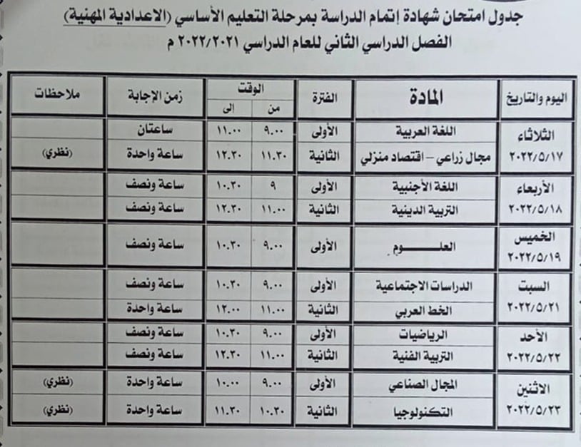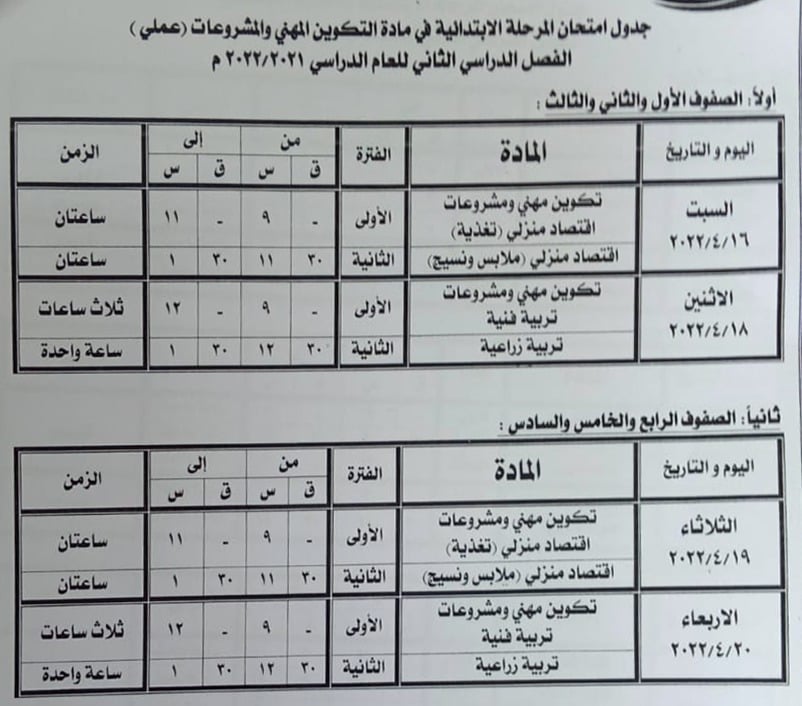 - الأول والثاني الثانوي الفني "من 7 إلى 11 مايو 2022"