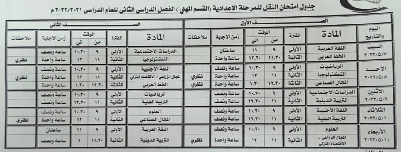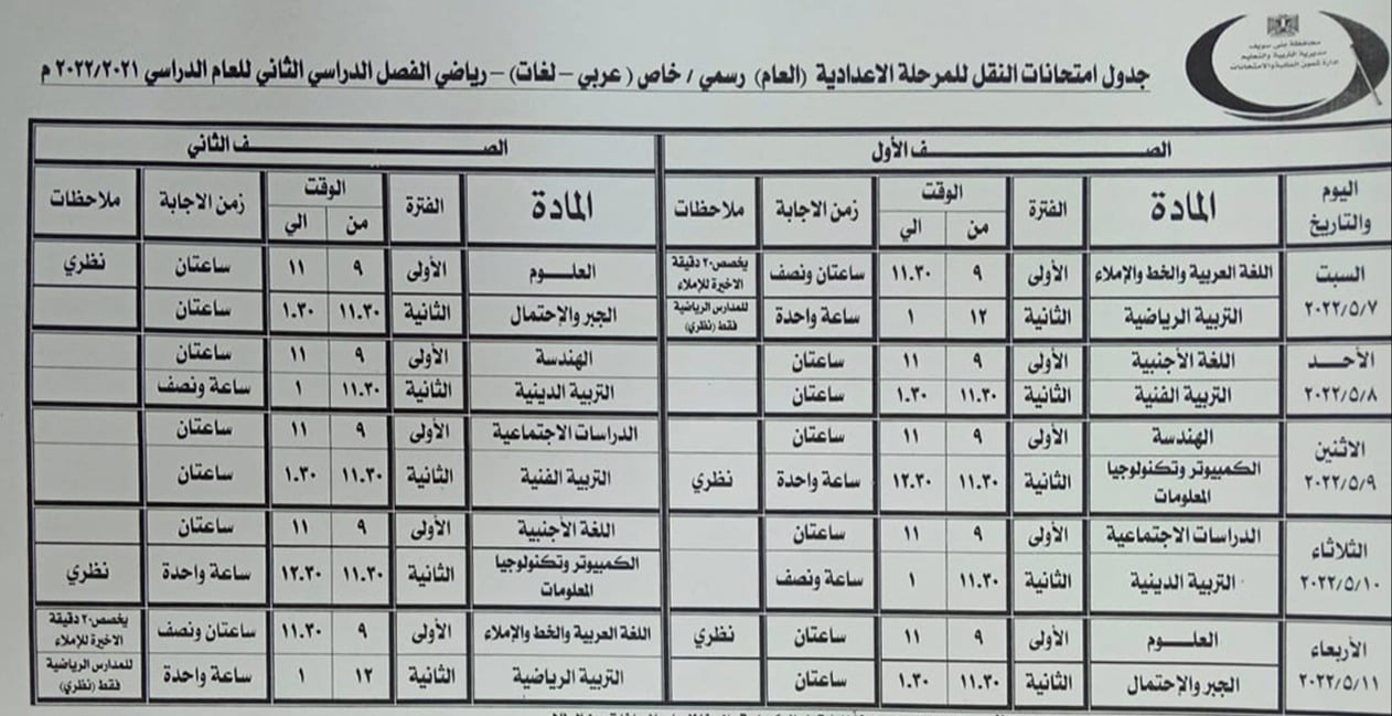 - الصفين الأول والثاني الإعدادي نقل "من 7 إلى 11 مايو 2022 "