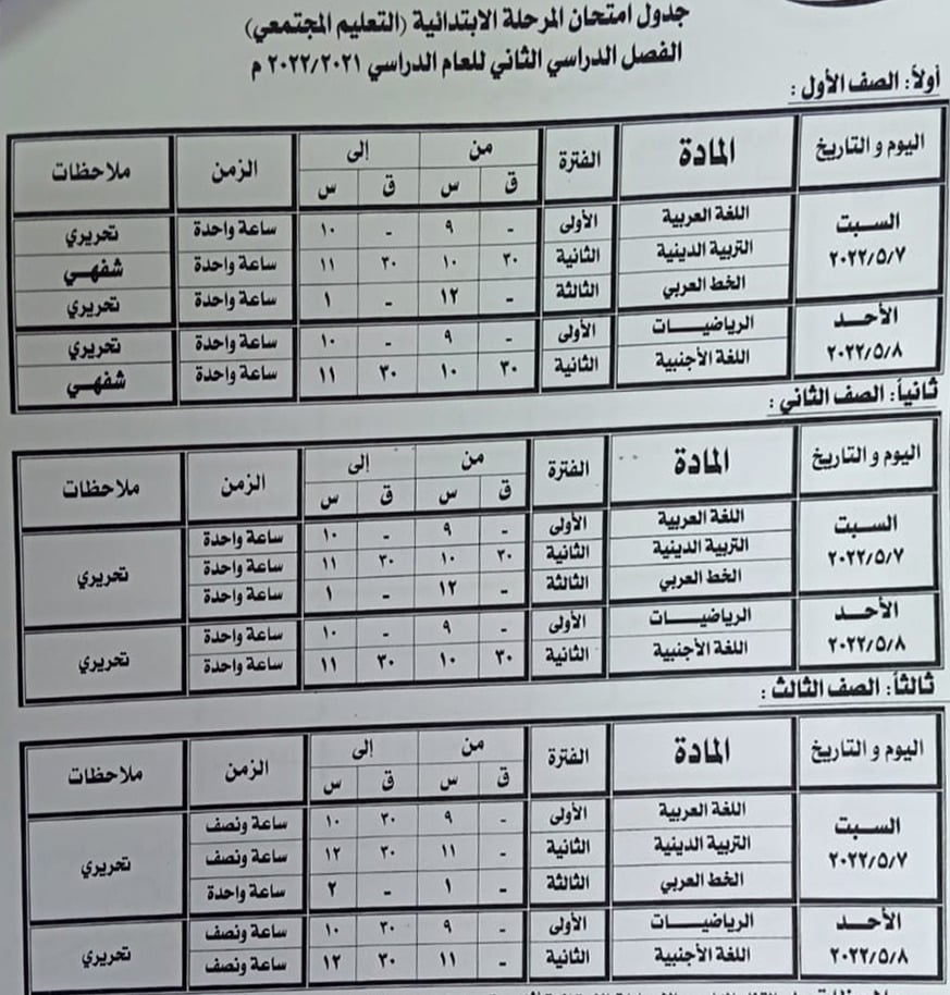 - الصفوف الأول والثاني والثالث  يومي" 7 و8   مايو 2022"