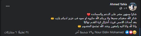 وكتب يحيى: "شكرا جمهور مصر على الدعم والمساندة وشكر الله سعيكم جميعا ولا يريكم الله مكروها أو سوء فى عزيز لديكم يارب بعد أحداث الأمس قررت اعتزال كرة القدم نهائيًا وإنا لله وإنا إليه راجعون وعند الله تجتمع الخصوم".