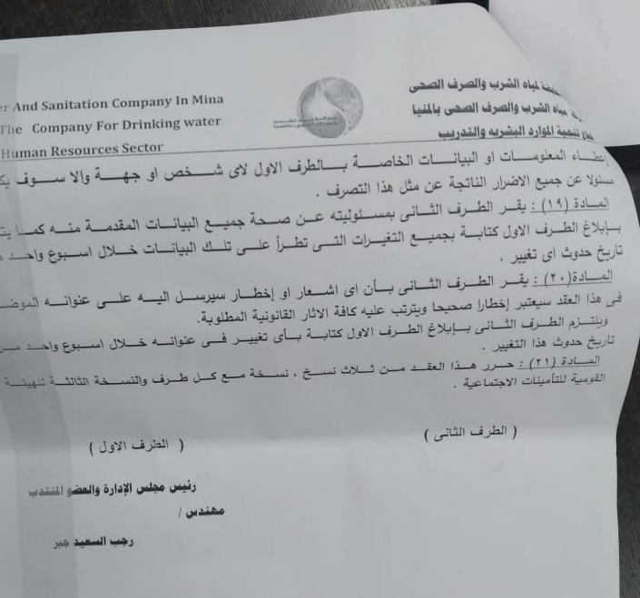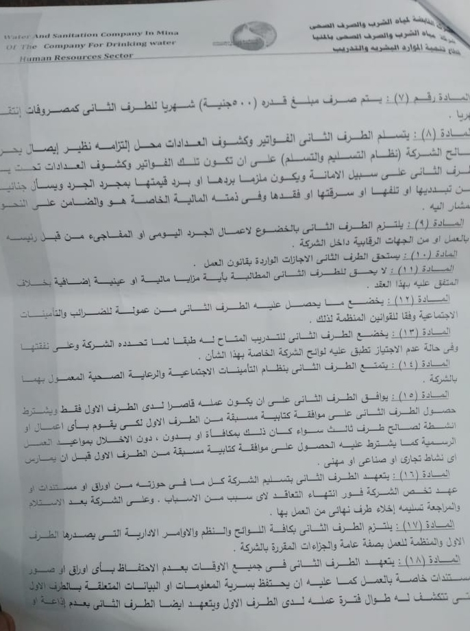 استغاث عدد من موظفي شركة مياه الشرب والصرف الصحي بالمنيا، بالرئيس عبد الفتاح السيسي الذي يحرص دومًا على المساواة بين العاملون في الأجور، لتقنين أوضاعهم المالية بداخل الشركة حيث أن البنود في العقد لا تتوافق مع أدميتهم.