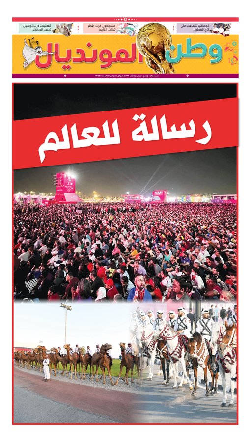 واهتمت الصحف القطرية بكل تفاصيل الافتتاح غير المسبوق لمونديال قطر، ونقلت صورا حية من الفعاليات التى أثارت انبهار العالم، حيث عنونت صحيفة وطن القطرية، المونديال رسالة للعالم، ونشرت صورا من الافتتاح الرائع في كأس العالم قطر 2022.