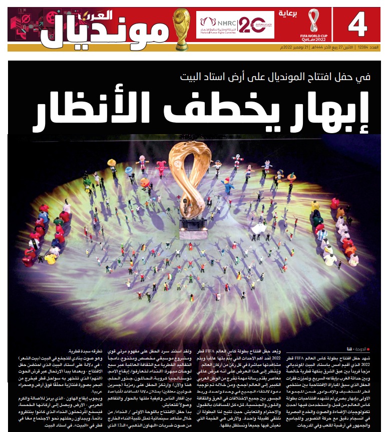 ونشرت صحيفة العرب القطرية عنوان، "إبهار يخطف الأنظار فى حفل افتتاح المونديال على أرض استاد البيت".