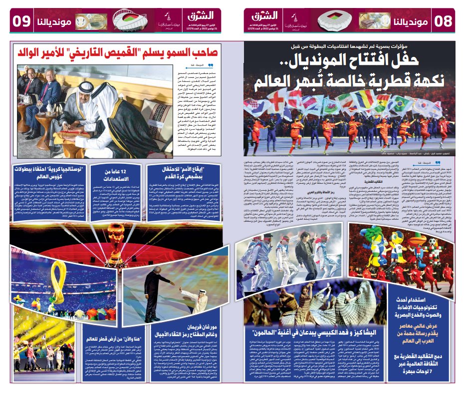 وأشارت الشرق إلى أن حفل افتتاح المونديال نهكة قطرية خالصة تبهر العالم، وصاحب السمو يسلم القميص التاريخي للأمير الوالد".