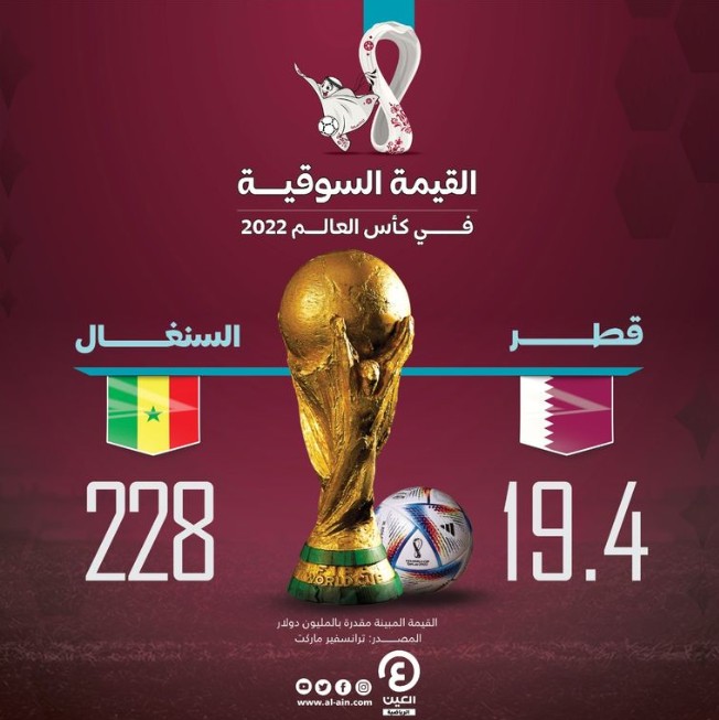 - على الجانب الآخر، فإن المنتخب السنغالي تبلغ قيمته السوقية 228 مليون يورو وهو الأعلى صعيد القارة الأفريقية.