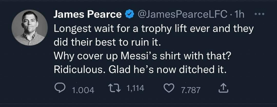 بينما انتقد جيمس بيرس الصحفي الإنجليزي اللقطة نقدًا لاذعًا: "أطول وقت في انتظار رفع الكأس على الإطلاق وبذلوا قصارى جهدهم لإفسادها، لماذا تتستر على قميص ميسي بهذا؟ سخيف.. سعيد لأنه تخلى عنها الآن".