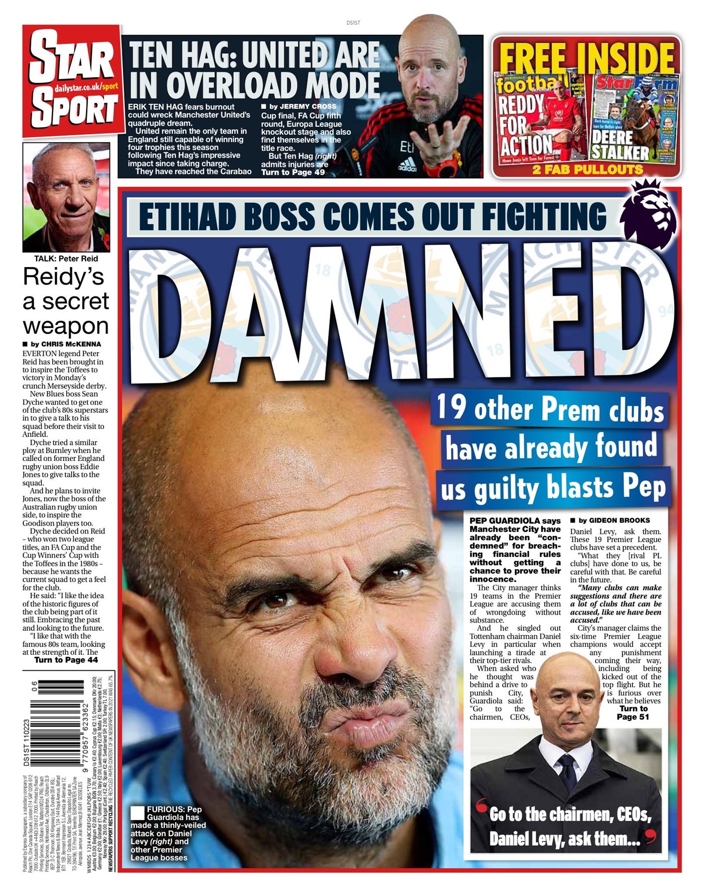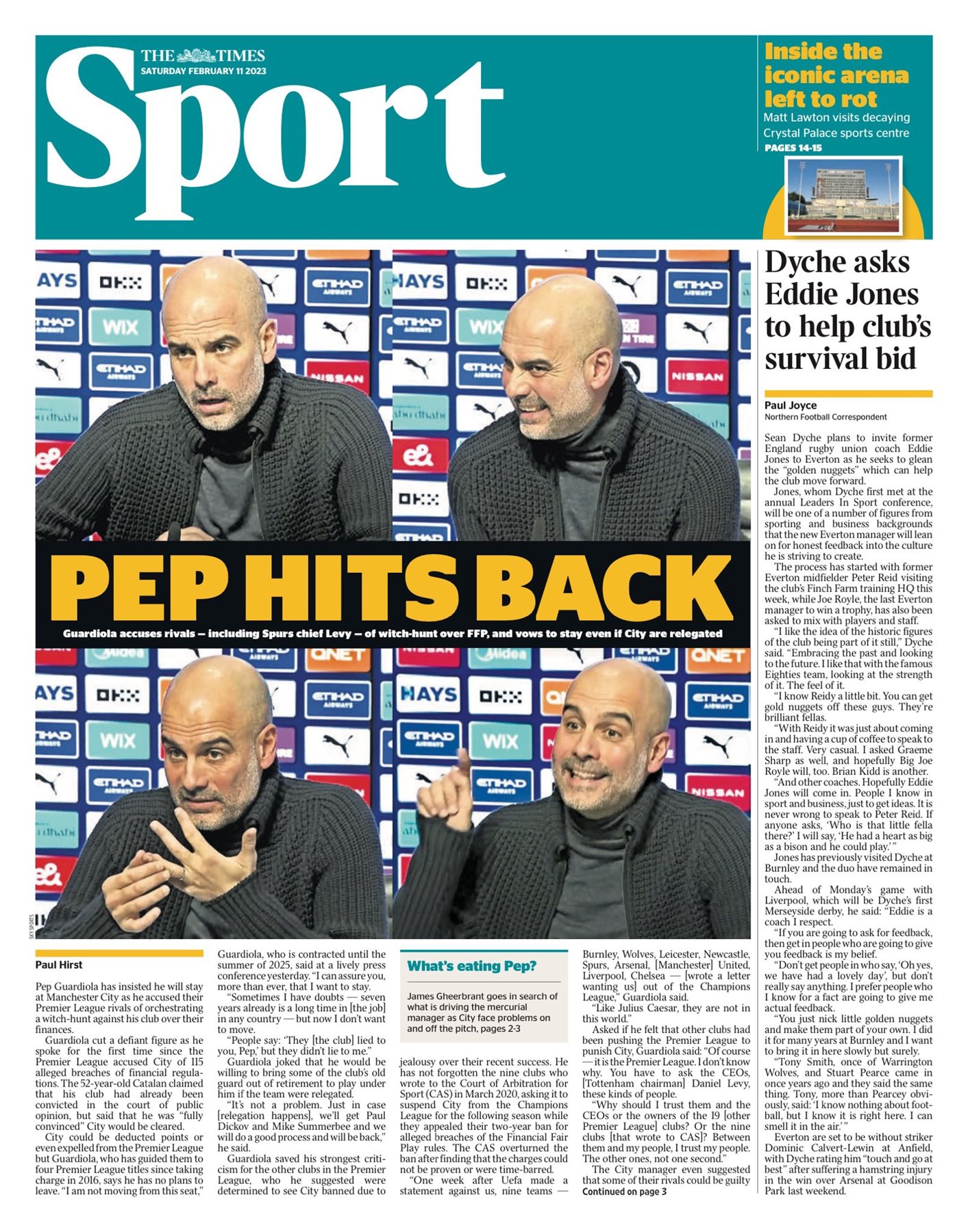 وقال بيب غوارديولا حول سبب رغبة الاندية الاخرى بإحداث ضرر لمان سيتي " لأننا لسنا جزءًا من الأندية المؤسسة لهذا الدوري."
