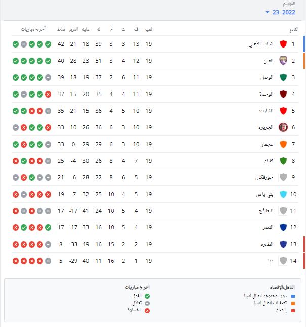- جدول ترتيب الدوري الإماراتي.. المركز الرابع عشر دبا خمس نقطة.