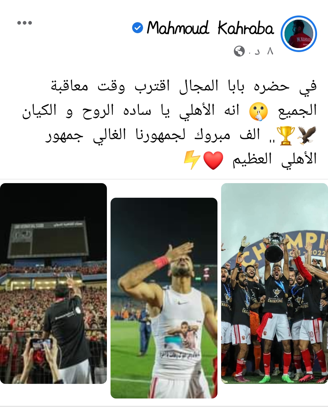 وجه محمود عبد المنعم كهربا لاعب الفريق الأول لكرة القدم بالنادي الأهلي، رسالة مثيرة للجدل عبر صفحته الرسمية على موقع التواصل الإجتماعي " فيسبوك"، عقب فوز الأحمر بكأس مصر.