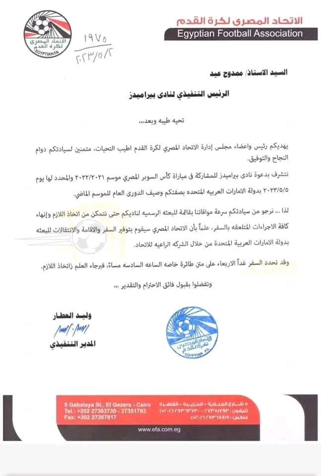 وأصدر اتحاد الكرة، بيانا، إلى نادي بيراميدز بدعوته للمشاركة في مباراة كأس السوبر المصري موسم 2021/2022، والمقرر لها يوم 5/2/2023 بدولة الإمارات العربية المتحدة بصفتكم وصيف الدوري العام الموسم الماضي، لذا نرجو من سيادتكم سرعة موافاتنا بقائمة للبعثة الرسمية لناديكم حتى نتمكن من اتخاذ اللازم وإنهاء كافة الإجراءات المتعلقة بالسفر، علما بأن الاتحاد المصري سيقوم بتوفير السفر والإقامة والانتقالات للبعثة بدولة الإمارات العربية المتحدة من خلال الشركة الراعية للاتحاد، وتحدد موعد السفر غدا الأربعاء على متن طائرة خاصة الساعة السادسة مساء.