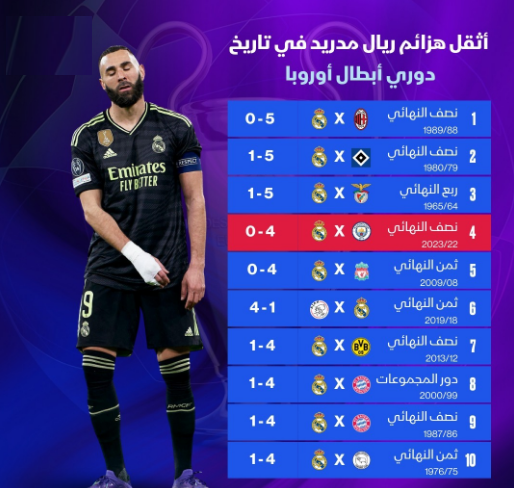 تعرض الفريق الأول لكرة القدم بنادي ريال مدريد الأسباني للخسارة على يد مانشستر سيتي بأربعة أهداف مقابل لا شيء في الموقعة التي جمعت بينهما على ملعب الاتحاد لحساب مباريات إياب الدور نصف النهائي من بطولة دوري أبطال أوروبا 2022-2023.