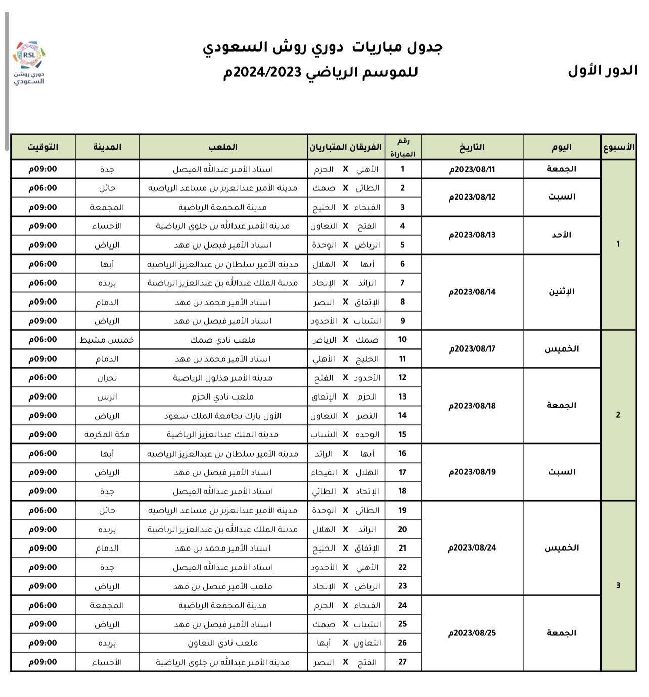 أعلن رابطة الاتحاد السعودي لكرة القدم، مواعيد مباريات الدور الأول من بطولة دوري روشن السعودي لموسم 2023-2024، والتي تبدأ الجولة الأولى بمواجهة الأهلي والحزم يوم الجمعة 11 أغسطس المقبل.