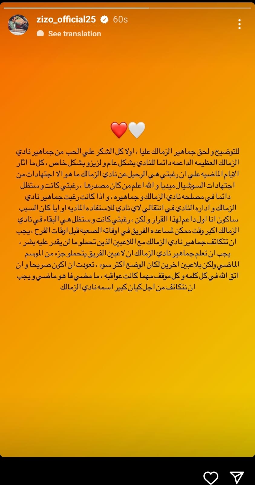 وقال زيزو :" للتوضيح و الحق جماهير الزمالك عليا ، اولا كل الشكر علي الحب من جماهير نادي الزمالك العظيمه الداعمة دائما للنادي بشكل عام ولزيزو بشكل خاص ".