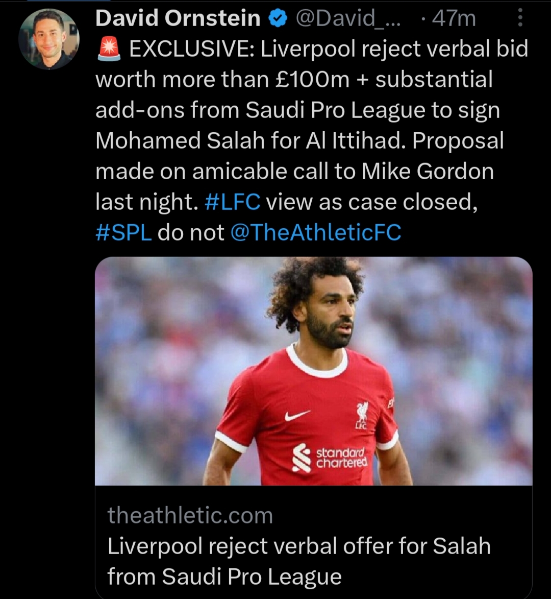 أكد الصحفي البريطاني ديفيد أورنستين، أن نادي ليفربول رفض عرضًا شفهيًا من رابطة المحترفين السعودية للتعاقد مع محمد صلاح.