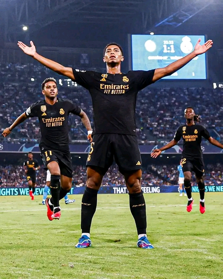 وفي الدقيقة 34 قام بيلنجهام بانطلاقة فردية من منتصف الملعب، ولم يستطع أحد من المدافعين إيقافه حتى وصل إلى منطقة الجزاء وصوب الكرة على يسار الحارس ليحرز الهدف الثاني للريال ويلعن أول تقدم للفريق ريال مدريد، في الدقيقة 53 عادي نابولي للمباراة بالتسجيل من ضربة جزاء ادركوا بها التعادل للاعب زيلينسكي.