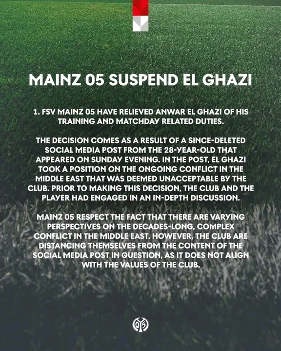 وجاء في بيان نادي ماينز عبر حسابهم الرسمي بموقع التواصل الاجتماعي على منصة "إكس" بشأن إيقاف اللاعب الهولندي أنور الغازي: "إدارة النادي قررت إيقاف الغازي من المشاركة في مباريات وتدريبات الفريق، وذلك بسبب المنشور الذي نشره عبر حسابه الرسمي على إنستجرام لدعم فلسطين".