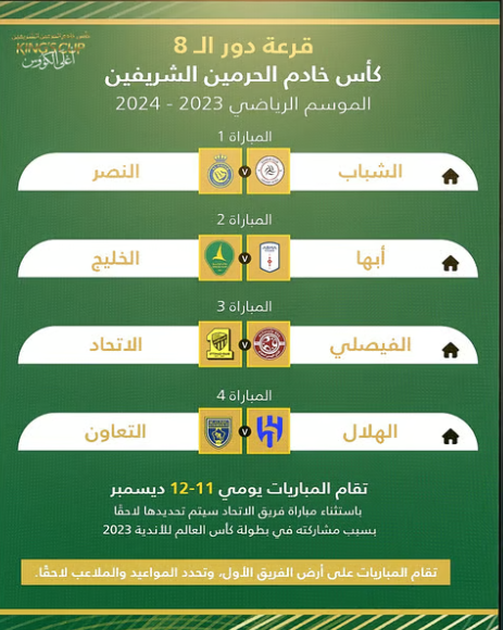 أسفرت قرعة كأس خادم الحرمين الشريفين، التي أُقيمت مساء اليوم الخميس، عن تحديد المباريات التالية في دور الربع نهائي: