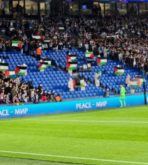 فقد ظهر أثناء مباراة ريال سيوسيداد الإسباني وبنفيكا البرتغالي في الجولة الرابعة من بطولة دوري أبطال أوروبا، مشجعوا الفريق الإسباني وهم يرتدون ملابس بيضاء ملطخة بالدماء تعبيرا عن ما يتعرض له سكان غزة من إبادة إسرائيلية، وقتل الأطفال والنساء وكبار السن من المدنين، ومحاولة الكيان الصهيوني لتهجير أهل القطاع وهدم البنية التحتية لدولة فلسطين.