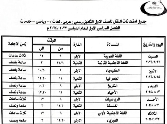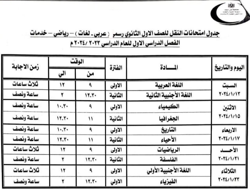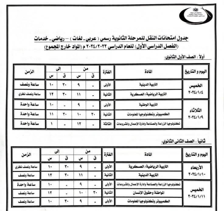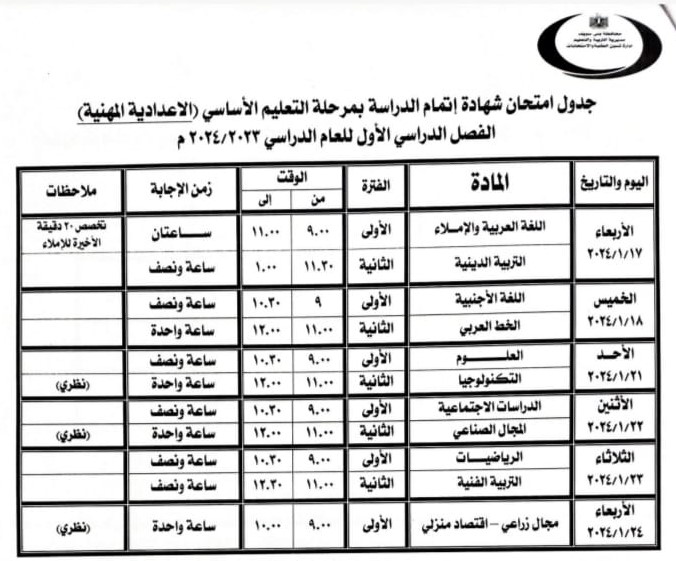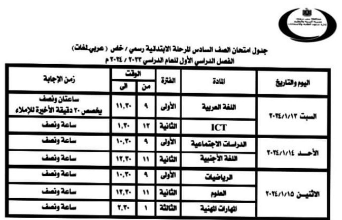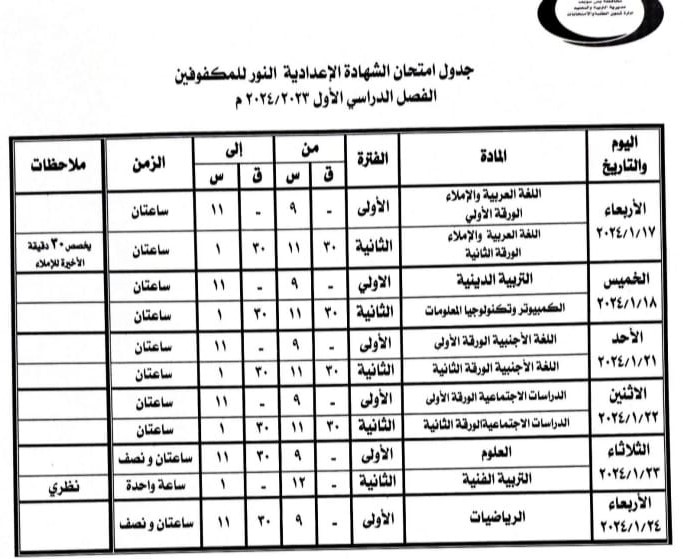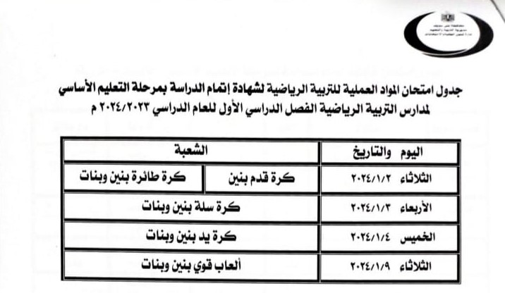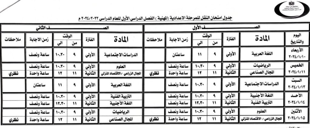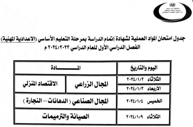أعلنت مديرية التربية والتعليم والتعليم الفني بمحافظة بني سويف، جداول امتحانات نهاية الفصل الدراسي الأول للعام الحالي 2023/2024م، لسنوات النقل بمختلف المراحل والشهادة الإعدادية العامة والمهنية "إتمام مرحلة التعليم الأساسي" والتي من المقرر أن يتم عقدها  في الفترة من 9 إلى 24 يناير المقبل.