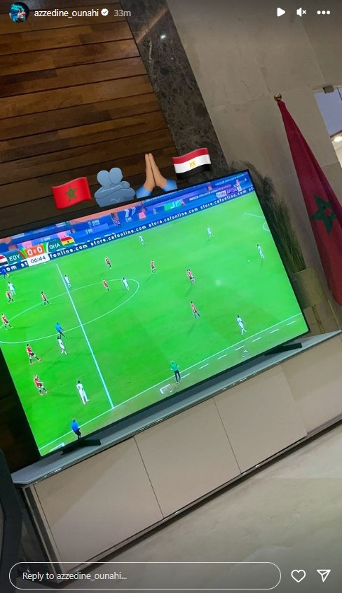 ونشر عز الدين أوناحي، صورة عبر خاصية الأستوري، بموقع التواصل الإجتماعي انستجرام، تبرز مشاهدته لمباراة مصر وغانا، مرفقًا الصورة بتعليق يعبر عن دعمه لمنتخب الفراعنة، وروح الاخوة بين مصر والمغرب.