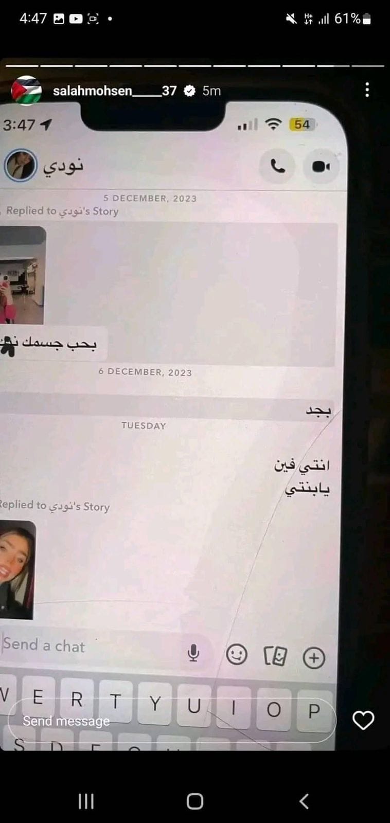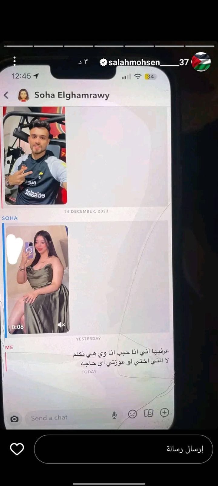 نشرت زوجة صلاح محسن، والتي تدعى إسراء سامح، لقطات شاشة من هاتف اللاعب، لمحادثات بينها وبين فتيات على «سناب شات».