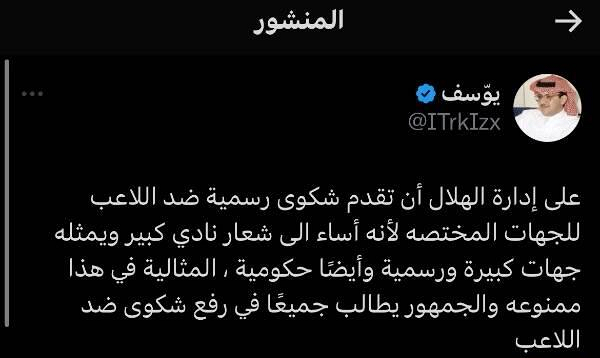 وكتب واحد من المغردين عبر موقع اكس تغريدة قال فيها:"على إدارة الهلال أن تقدم شكوى رسمية ضد اللاعب للجهات المختصة، لأنه أساء إلى شعار نادي كبير، ويمثله جهات كبيرة ورسمية وأيضًا حكومية، المثالية في هذا ممنوعة والجمهور يطالب جميعًا برفع شكوى ضد اللاعب".