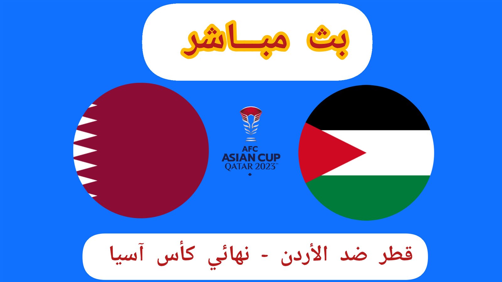 كانت تنتقل أحداث مباراة قطر والأردن في نهائي كأس آسيا 2023، عبر القنوات التالية Alkass EXTRA One HD وAlkass EXTRA TWO HD وSSC1 HD وAl-Rabiaa Iraq وAbu Dhabi Sports Asia 1 وbeIN ASIAN CUP 1.