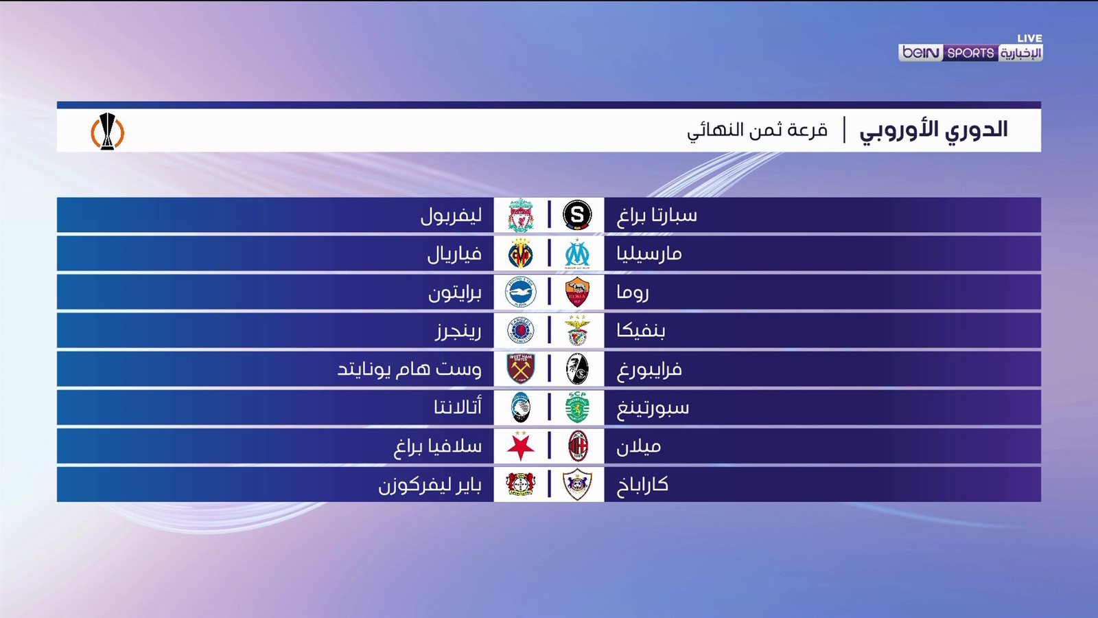 ويشهد دور الـ16 من بطولة الدوري الأوروبي، تواجد الفرق التالية؛ ليفربول وبرايتون ووست هام من إنجلترا، وأتلانتا الإيطالي وباير ليفركوزن الألماني ورينجرز الأسكتلندي وسلافيا براج التشيكي، فياريال الإسباني.