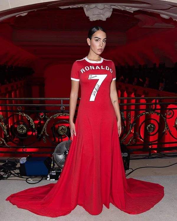 حضرت جورجينا، مؤخرًا، أسبوع الموضة في العاصمة الفرنسية، باريس، ولفتت الأنظار بإرتداء فستان باللون الأحمر يشبه القميص الرياضي ويحمل رقم “7” الخاص بكريستيانو رونالدو، إضافة إلى توقيعه.