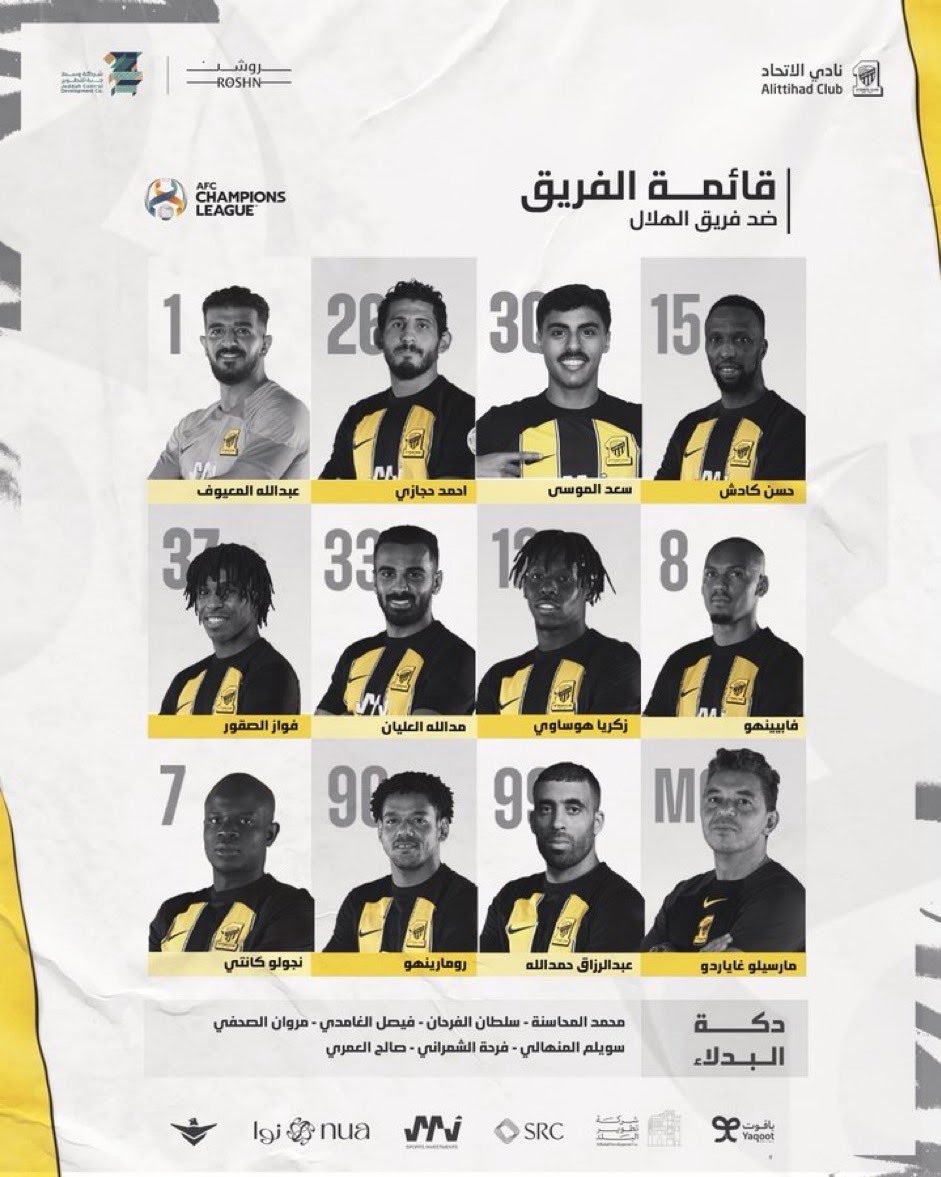بقيادة المدرب البرتغالي خورخي جيسوس، كشف الهلال عن تشكيلته لمواجهة غريمه التقليدي الاتحاد، بقيادة المدرب الأرجنتيني مارسيلو جاياردو، في ذهاب ربع نهائي دوري أبطال آسيا.