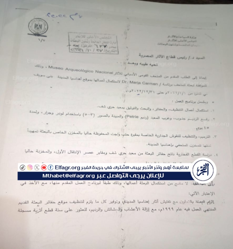 وحصلت بوابة الفجر الإلكترونية على المستندات والتي تؤيد تلك المذكرة رسمية التي تم تقديمها للأمين العام السابق د. مصطفى وزيري، وعدد من المكاتبات التي تثبت عدم تحرك المنطقة لإنقاذ تلك القطع من الضياع وكذلك صورة من السجل الرسمي لتسجيل آثار البعثة.