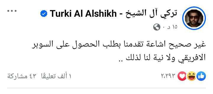 نفى تركي الشيخ، كل ما تردد، وكتب عبر حسابه الشخصي على موقع التواصل الاجتماعي “فيسبوك”: “غير صحيح إشاعة تقدمنا بطلب الحصول على السوبر الأفريقي ولا نية لنا لذلك”.