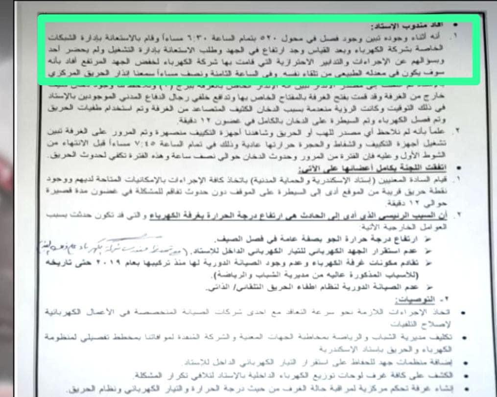 وفي سياق متصل كتب عاطف شادي المنسق الإعلامي لنادي بيراميدز عبر موقع التواصل الإجتماعي منذ دقائق قليلة:" أظن التقرير واضح إهمال جسيم وعطل في الكهرباء معروف من قبل المباراة وما حدش اتحرك لإنقاذ الموقف ما تسبب في الحريق، يعني الموضوع مش ظرف قهري خالص ومشكلة كهرباء واللائحة واضحة فوز بيراميدز 2-0 ".