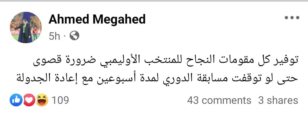 وقال مجاهد في تدوينة عبر حسابه الرسمي على "فيس بوك":"توفير كل مقومات النجاح للمنتخب الأوليمبي ضرورة قصوى حتى لو توقفت مسابقة الدوري لمدة أسبوعين مع إعادة الجدولة".