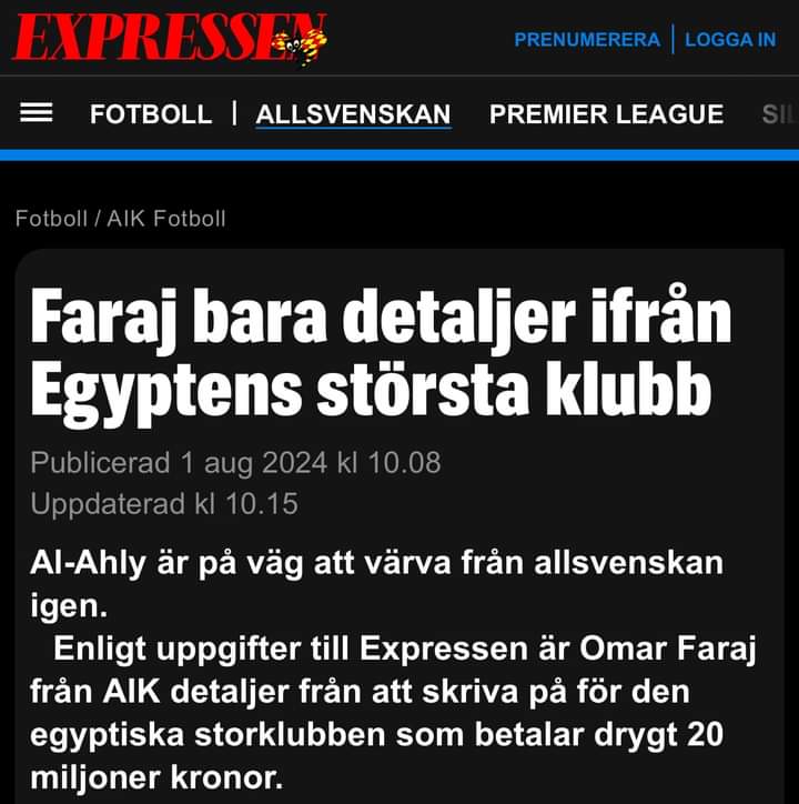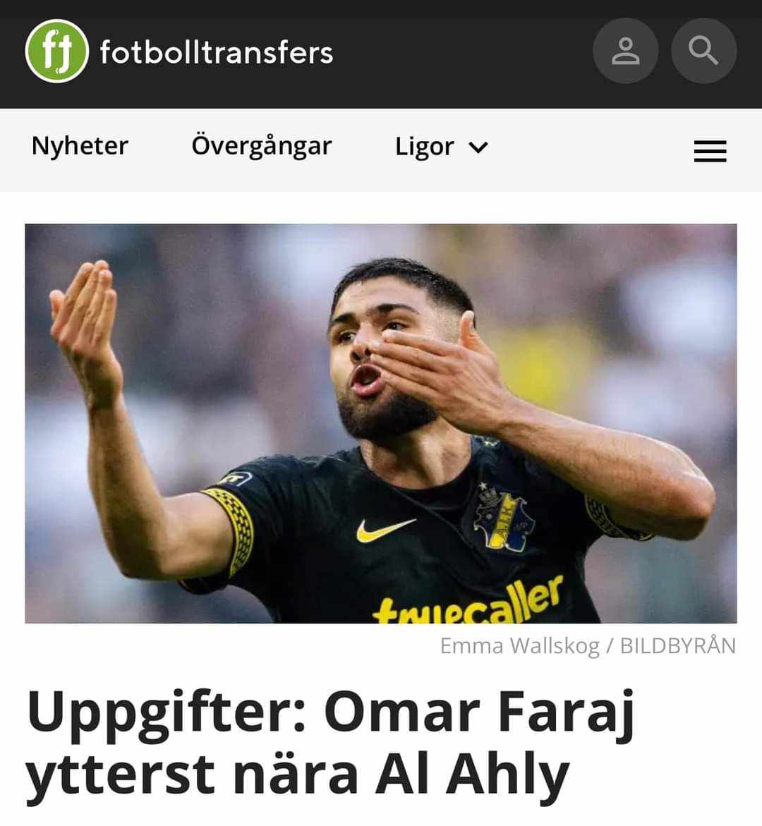 وتابعت، النادي الأهلي لديه يراقب اللاعب ويدرس إمكانية التعاقد مع المهاجم، حيث كان من المفترض أن يقبل AIK عرضًا من النادي.