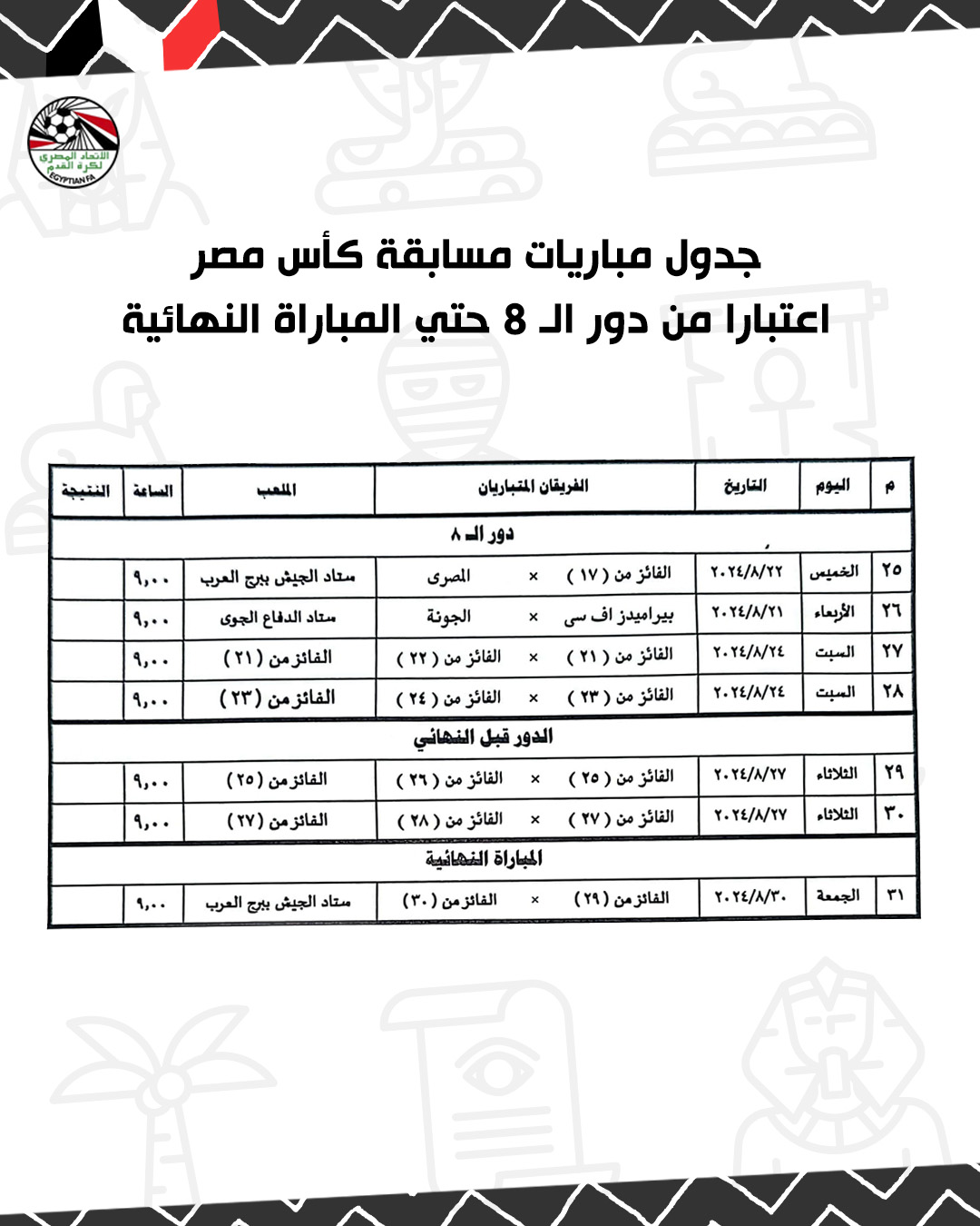 ورغم انتهاء مباريات دور الـ16 يوم الأربعاء 21 أغسطس، قرر الاتحاد المصري لكرة القدم بدء منافسات دور الثمانية في اليوم التالي، الخميس 22 أغسطس. ومن المقرر أن تُقام المباراة النهائية للبطولة يوم الجمعة 31 أغسطس.