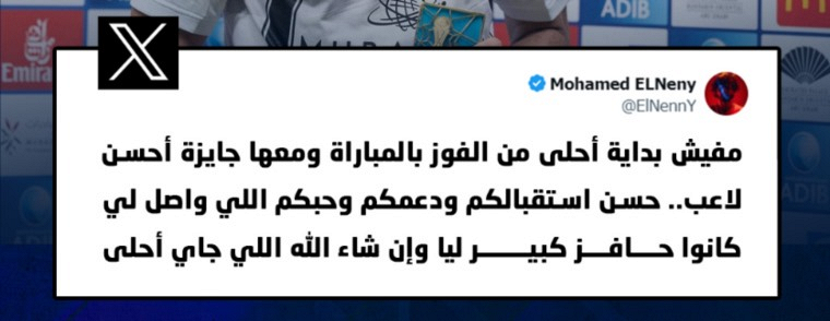 وكتب النني على حسابه الخاص بموقع إكس "لا يوجد بداية أفضل من الفوز بالمباراة ومعها جائزة أفضل لاعب".